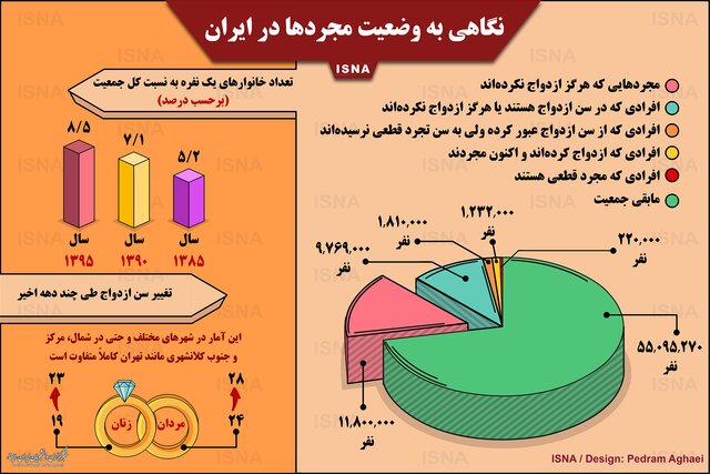 طبق آخرین سرشماری کل کشور، ۹ میلیون و ۷۶۹ هزار نفر در سن متعارف ازدواج و هرگز ازدواج نکرده در ایران وجود دارند و تعداد افرادی که از سن متعارف ازدواج عبور کردهاند اما هنوز به سن تجرد قطعی نرسیدهاند، یک میلیون و ۸۱۰ هزار نفر بوده است. به افرادی که از سن تجرد قطعی عبور کرده باشند، مجردان قطعی میگویند و تعداد آنها در کل کشور ۲۲۰ هزار نفر است. در اینفوگرافی پیش رو به وضعیت مجردها از نگاه آمار و ارقام نگاهی انداختهایم. این آمارها را مدیرکل دفتر جمعیت نیروی کار مرکز آمار ایران اعلام کرده است.