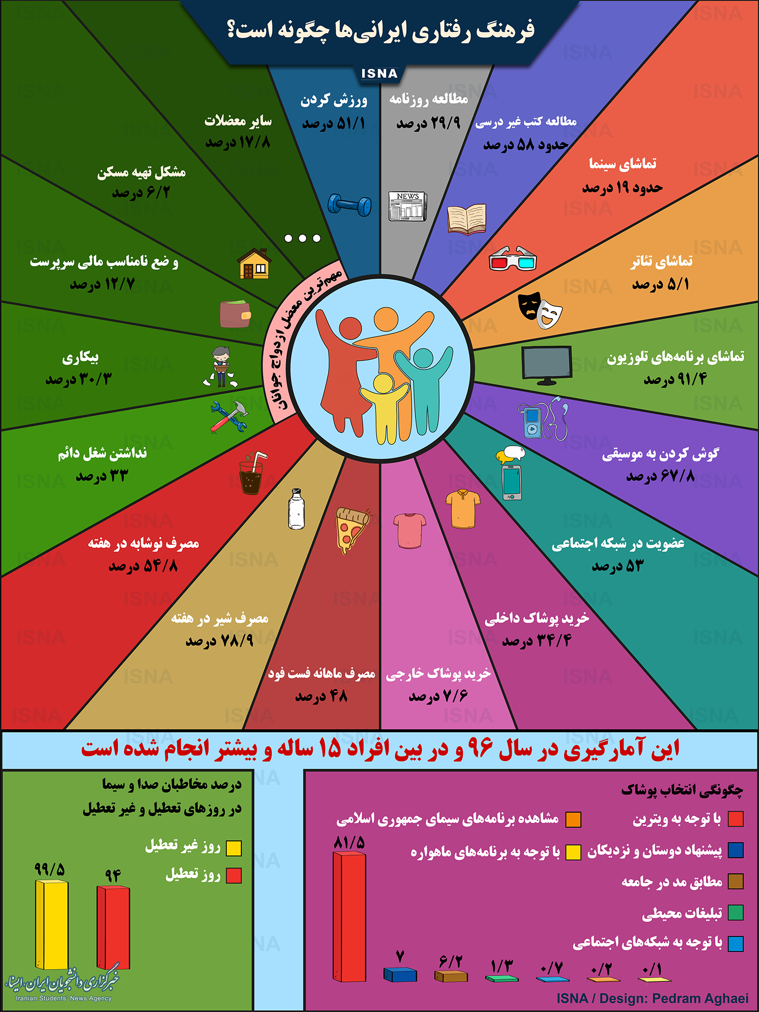 طرح آمارگیری از فرهنگ رفتاری خانوادههای ایرانی در سال ۹۶ در نقاط شهری و روستایی برای افراد ۱۵ ساله و بیشتر اجرا شد. در این طرح سرانه برخی رفتارهای فرهنگی ایرانیان مانند مطالعه، تماشای تئاتر، رفتن به سینما، موسیقی، تماشای سیمای جمهوری اسلامی، مصرف شیر، نوشابه و ... مورد بررسی قرار گرفت. در اینفوگرافی پیش رو، جزییات این طرح مشخص شدهاست.